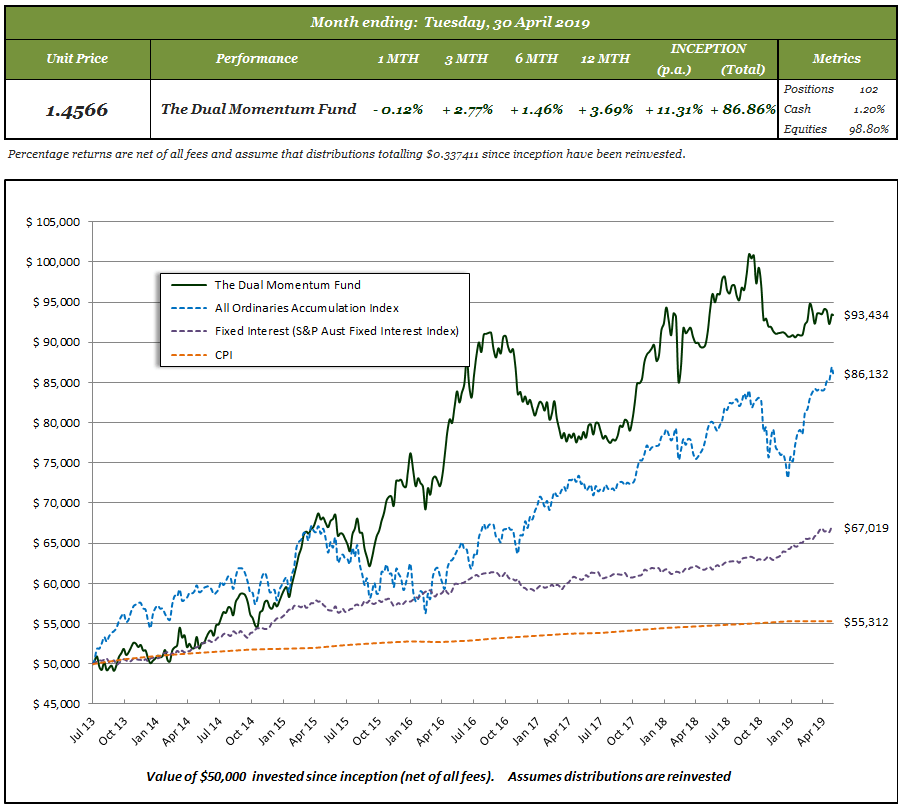 The Fund returned -0.12% for April, disappointing on the surface compared to broad market indices but not surprising and indeed somewhat encouraging in a period when global momentum as an investment style has been experiencing one of its ‘off’ periods. Recent research from the US has highlighted that the momentum style has experienced abnormally soft returns across most major global markets (with the exception of Australia) since the downturn in October last year (see research here and here). This global context puts some perspective around the Fund’s YTD return of +2.89% and we remain confident that the portfolio is well positioned to take advantage of the inevitable reversion of the Momentum style to its more normal pattern of returns.