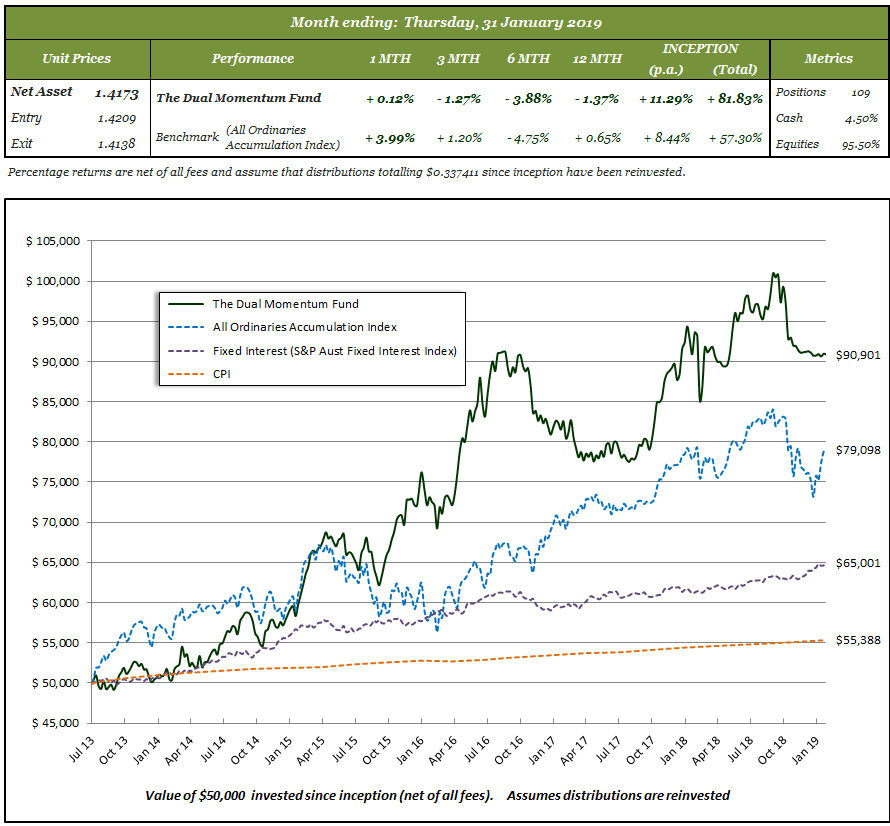 Strength gradually return to most of our markets during January such that by the second week of the month an increasing number of new and resuming trends were being identified. Our positive but relatively modest return of +0.12% for the month is reflective of our large opening cash balance and the only gradual deployment of that cash into new equity positions. Once commenced, the deployment of cash into emerging opportunities continued throughout the month such that at month end our equity positions comprised 95.5% of the portfolio, with just 4.5% remaining in cash.